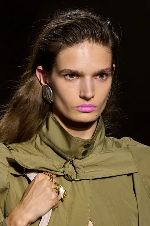 Любителей минимализма визажисты тоже не оставили без актуальных трендов. Правило, которым стоит пользоваться при выборе нюдовой помады в 2026 году, — «ваши губы, только лучше». Никаких холодных, сероватых оттенков, которые часто можно найти в нюдовой палитре. Делайте ставку на предельно натуральные розовые тона: оттенок помады должен быть максимально приближен к оттенку ваших губ. Идеальный референс нашелся на показе Dolce & Gabbana.