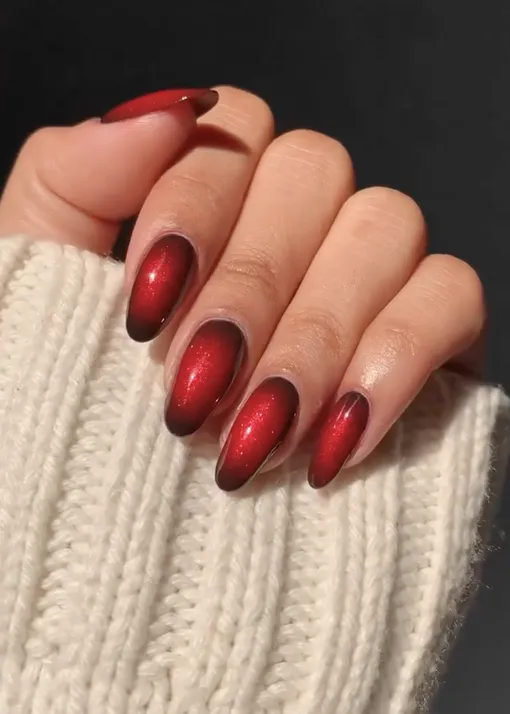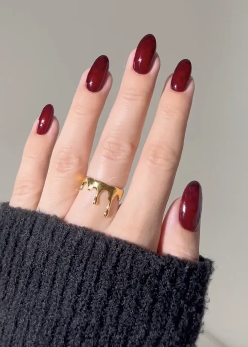 «Вампирские» ногти — готическая интерпретация привычного красного маникюра. Самая популярная техника его выполнения — аура. Возможно вы помните этот яркий летний нейл-тренд с цветным «свечением». В новой вариации нежные оттенки розового и оранжевого заменили насыщенный бордовый и кроваво-красный, а по краям добавились темные, иногда даже черные блики. Получается своеобразный эффект омбре, только переход цвета идет не по вертикали или горизонтали, как мы привыкли, а от центра к краям ногтя.