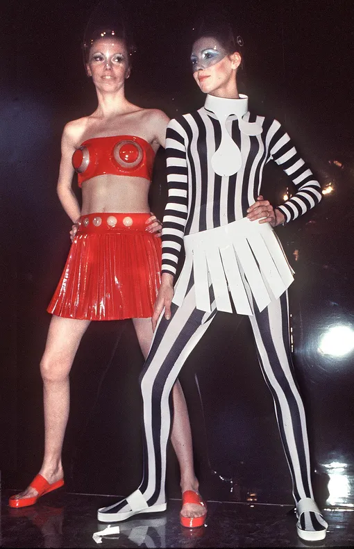 Еще один легендарный коллега и современник Куррежа (а заодно и его основной конкурент за звание главного футуриста от моды) — Пьер Карден. Дизайнер с самого своего дебюта активно экспериментировал с формами, материалами и аксессуарами — в его понимании «космическая» одежда должна была быть не только эффектной, но еще и функциональной. Он одним из первых начал активно использовать пластик — в своей кутюрной коллекции весна-лето 1970 он сделал из него защитные экраны, напоминавшие шлемы космонавтов (Карден буквально смотрел в будущее – нечто подобное было бы очень полезно в наше пост-пандемийное время). Также исследовательницы космоса, по его версии, должны были носить облегающие кэтсьюты из сетки и расклешенные мини-юбки — наука наукой, а моду никто не отменял.