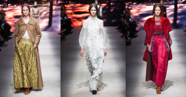 Новую коллекцию Альберта Ферретти посвятила сильной женщине эпохи Возрождения со всеми отсюда вытекающими последствиями. Платья разных форм, длины и цветовых решений, но преимущественно с кружевными и полупрозрачными деталями. Исторический посыл подчеркнут объемными воротничками, а пальто, украшенные цветочными принтами, выглядят так, будто бы их шили для сказочной принцессы. На прошедшем минувшим вечером показе модели выходили словно из зачарованного леса – такой эффект создавался за счет компьютерной проекции.