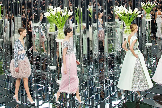 Первое, что бросается в глаза при взгляде на новую кутюрную коллекцию Chanel, — подчеркнуто одинаковый силуэт всех образов с показа. Тонкая талия, перевязанная ремнем, и объемная линия бедер. По задумке Карла Лагерфельда такой силуэт должен отсылать образованного зрителя к скульптуре Альберто Джакометти «Женщина-ложка» (1927).