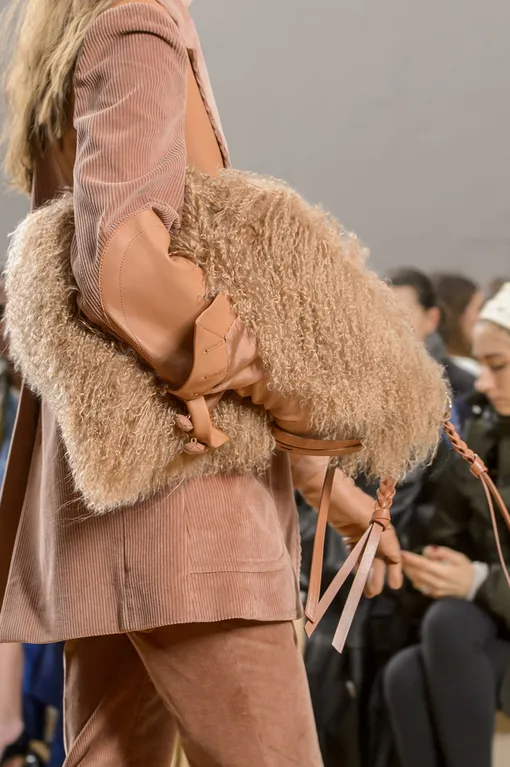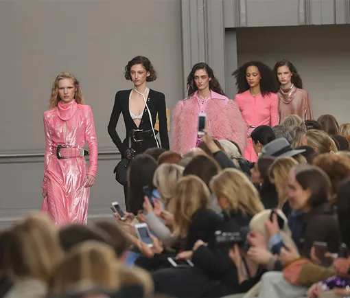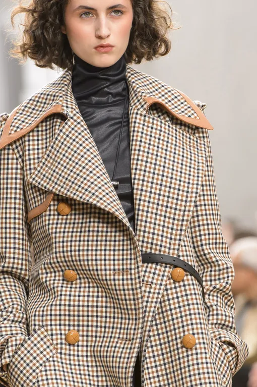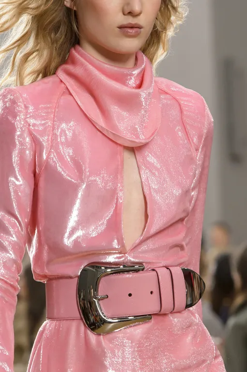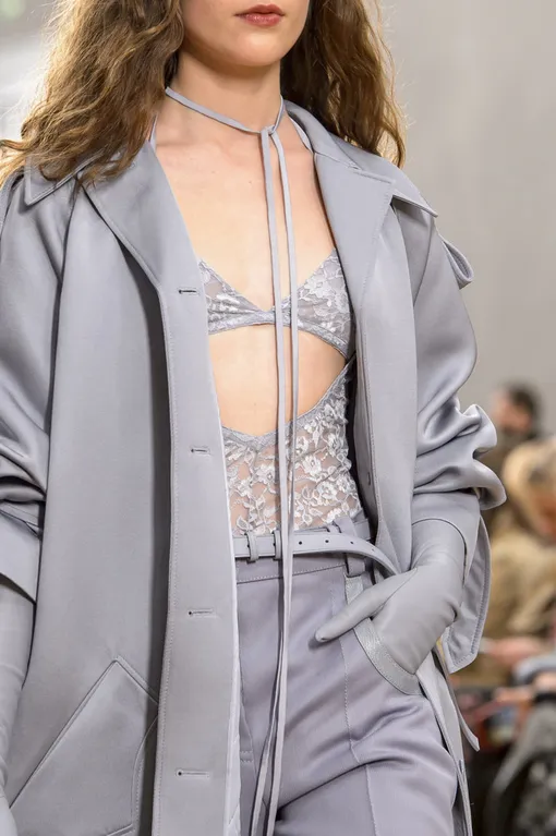 Вот только в адаптации для женского гардероба все эти вещи ну очень сильно дышат эротикой: ковбойские брюки тут с вырезами на бедрах вместо карманов, атласные комбинации и лифы от купальников выступают в паре с гипюровыми платьями с декольте до самой талии, топы имитируют расстегнутые боди, плюс имеются кружевные перчатки и чулки. Этот набор пошел бы на ура в горячем музыкальном видео поп-звезды эпохи нулевых. Но на подиуме Nina Ricci, благодаря не будуарной, а мягкой натуральной палитре, он тоже выживает - спасибо дозе объемных пальто, тренчей и кардиганов поверх, мягкому трикотажу и строгим секретарским костюмам.
