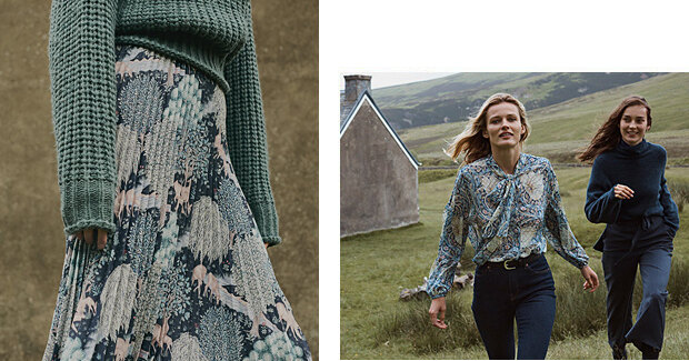 Несколько архивных паттернов легендарной компании вошли и в коллекцию H&M. Например, на романтичные платья, летящие юбки и шейные платки помещены рисунки в виде цветов, деревьев и сказочных существ. Есть также небольшой мешочек на цепочке с изображением листьев и бутонов, который подойдет к повседневному трикотажному комплекту и вечернему наряду из бархата. Принтованную рубашку шведский бренд надел на теплый свитер — это новое сочетание сейчас актуально и в стритстайле.