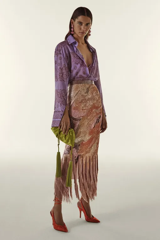 Джорджия Тордини и Джильда Амброзио представили себе эдакую современную цыганку-джетсеттера, которая путешествует в мыслях и наяву, смешивая самые странных и богемные вещи из своего гардероба в одном наряде для выхода в свет. В предосенней коллекции Attico Pre-Fall-2020, тем не менее, сразу же можно определить эпоху, которая сегодня вдохновляет девушек-дизайнеров больше всего: это начало 2000-х с их смелой сексуальностью, стремлением к эмансипации и здоровой долей бесшабашности на грани вульгарности. Благодаря последней мы не будем бояться носить алые платья макси, расшитые перьями, а к красным кожаным брюкам добавлять леопардовый пиджак оверсайз. А декорированный разноцветными камнями топ-бандану будем сочетать с трендовыми брюками карго. Блузы с опасным декольте до пупка из тонкого шелка Тордини и Амброзио предлагают носить с юбкой-платком с бахромой: что ж, в компании лодочек на шпильке лучшего образа для коктейля не придумать!