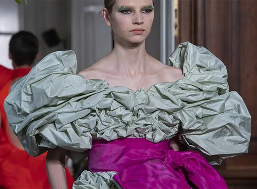 Прошедшее накануне шоу Valentino стало одним из самых запоминающихся на минувшей Неделе высокой моды. Мастер по работе с цветом Пьерпаоло Пиччоли в очередной раз не подвел взыскательную фэшн-публику. Каждый образ был продуман до мелочей, которые можно рассматривать бесконечно. Связующим звеном стал мейкап — великая Пэт МакГрат нарисовала моделям «вторые» брови из цветного глиттера — синего, сиреневого, розового, лазурного. Но даже они едва могли отвлечь внимание от фантазийных головных уборов, инспирированных национальными нарядами разных стран. Здесь же фирменные банты Valentinо всех мастей и объемов, драпировки и сложные аппликации в лучших традициях haute couture.