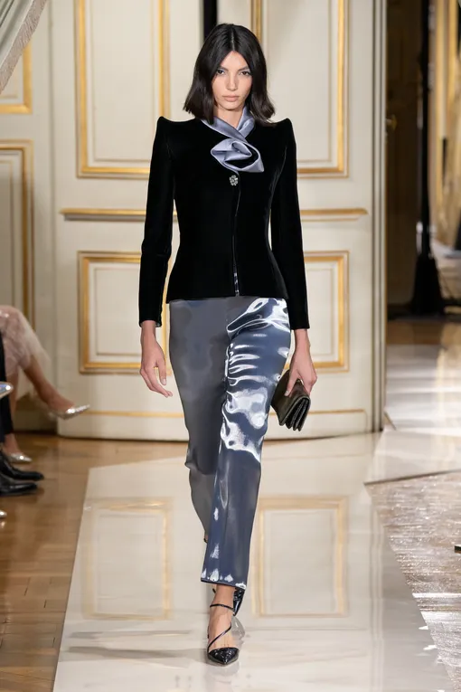 Брючные костюмы на все времена и платья из ткани «жидкий металл» в «сияющей» коллекции Armani Privé
