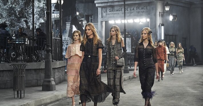 Перед началом показа гости собрались в Cinecittà на коктейль Chanel и закрытый просмотр нового фильма Лагерфельда Once and Forever с Кристен Стюарт и Джеральдин Чаплин. Потом все собравшиеся переместились в Teatro N°5 – тот самый павильон, в котором любил работать Феллини. К показу Chanel Métiers d’Art его подготовил дизайнер Марсель Карне, создавший черно-белые декорации в духе Александра Траунера, великого художника-постановщика прошлого века. Под звуки фортепиано, рождавшиеся под пальцами композитора Кристофа Шассоля, модели Chanel появлялись друг за другом в новых образах Chanel Métiers d’Art.