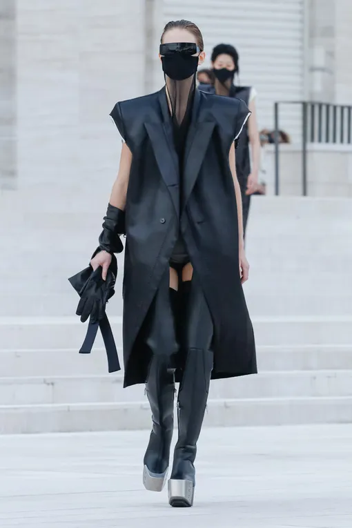 Три ключевых элемента и связующих звена между луками — огромные гипертрофированные плечи, ботфорты на впечатляющей платформе и маски — уже не только знаковый для Оуэнса аксессуар (они и раньше нередко появлялись в его шоу), но и неизбежный пост-ковидный атрибут. Не только в буквальном, но и в переносном смысле — как некое сообщение и правильный посыл для окружающих. В этом смысле он сравнил их с замысловатыми шляпками французских женщин времен Второй мировой — они использовали экстравагантные аксессуары как молчаливые насмешки над немецкими оккупантами. Маски же работают ровно в обратном направлении — они уже успели стать негласными знаками уважения. Нашлось в коллекции место и сетке (из нее сшиты топы и мини-платья), которая уже появилась сразу в нескольких новых коллекциях сезона и претендует на статус будущего весеннего тренда. К слову, у Оуэнса она оказалась еще и экологичной: сетчатые платья были сшиты из масок, использованных в осеннем показе 2012 года. Дизайнер хоть и вдохновляется адом, но о судьбе планеты все же беспокоится. Помимо узнаваемого силуэта и пост-апокалиптичных аксессуаров, в коллекции предсказуемо появилось множество элементов деконструкции в виде асимметрии, драпировок и внутренних деталей одежды напоказ (на шортах были белые клапаны, напоминающие внутреннюю часть карманов). В общем, Оуэнс как блестяще отыграл свои хрестоматийные партии, так и добавил достаточно новых элементов, так что довольны останутся и его верные адепты, и вечно жаждущая новизны модная публика.