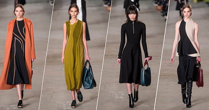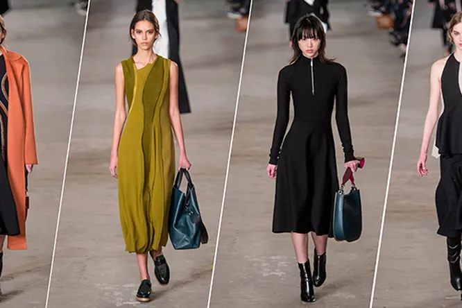 Из прошлого осенне-зимнего сезона дизайнер захватил с собой в новый эффектные цветовые блоки, но на этот раз не резко контрастные, которые придавали моделям воинственный вид, а построенные на сильных дополнительных цветах: брусничный с фуксией, шоколадный с хаки и так далее. Откровенную асимметричность мы тоже видели у Ву и раньше, но сейчас она служит не для воскрешения и без того бессмертного духа Баухауза, а для создания женственного и, не побоимся этого слова, соблазнительного силуэта. Как сказал сам дизайнер, его крой остается линейным, только теперь эти линии округлые и нежные, повторяющие формы женского тела. Та же тенденция прослеживается и в коллекции аксессуаров: объемные, но не слишком большие сумки-хобо скроены из кусков кожи контрастных цветов – с их помощью создается абстрактный рисунок в духе оп-арта. А он в свою очередь рифмуется со скругленными носами ботильонов на высоком деревянном каблуке и лоферов на такой же деревянной платформе. Использование самого «природного» из материалов заслуживает особого внимания – Boss раньше не был замечен в интересе к экостилю. Но, похоже, это часть новой стратегии Ву: он явно собирается спустить женщину Boss из офисного поднебесья на более твердую почву. Впрочем, если она будет ходить по ней с таким же спокойным изяществом и уверенностью, как модели на осенне-зимнем показе, то вряд ли кто-нибудь из верных поклонниц бренда будет слишком громко протестовать.