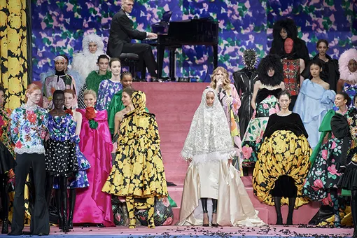 Цветы с головы до пят, платья в стразах и мужские костюмы в коллекции Richard Quinn