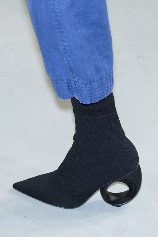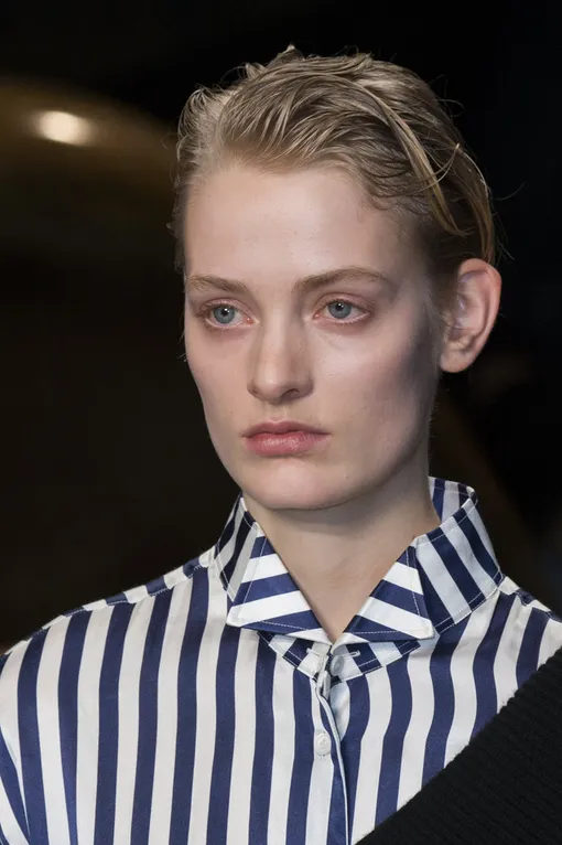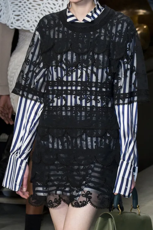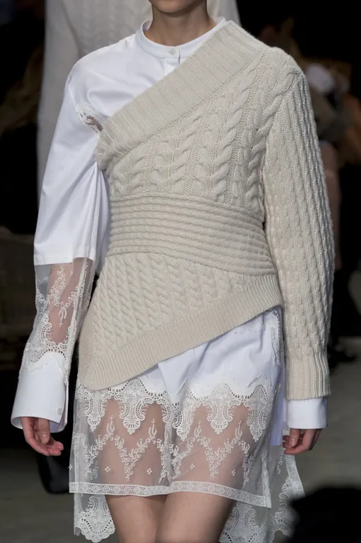 К великому облегчению, ни один бежевый тренч во время деконструкции не пострадал — в новой коллекции его замещают широкоплечие плащи и хлопковые платья-рубашки асимметричного кроя, а единственный классический черный тренч носят, надев только один рукав, второй зафиксировав поясом. Зато трикотажу крупной вязки, классическому бушлату, как символу военно-морской славы Burberry, и английскому шитью досталось по-настоящему. Первый тянется по диагонали поверх платьев, точно гигантские бинты, от второго остается лишь узорная тесьма, собирающаяся в болеро на плечах, а третье пухнет болезненными пышными складками, ломая привычный силуэт и контрастируя с юнговскими бретонками.