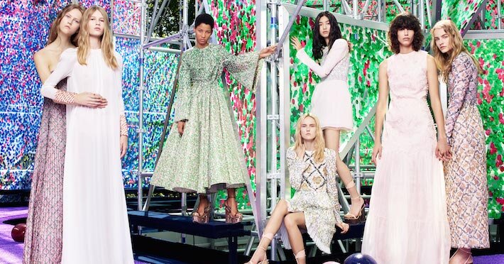 Одним из самых красивых и, надо признать, довольно неожиданных моментов стала связь коллекции с искусством французских пуантилистов. Точечные рисунки, покоряющие гаммой пастельных оттенков, дизайнер нанес на поверхность тканей, а их более яркую версию – на пластины, из которых в парижском саду был выстроен разноцветный павильон. Его полупрозрачные своды, сиреневый подиум и разбросанные повсюду предметы, похожие на спелые ягоды, сыграли особую роль в создании атмосферы. Тема соблазна, чувственности и удовольствий, идущих рука об руку с небесной карой, Рафом Симонсом раскрыта. И очень красиво.