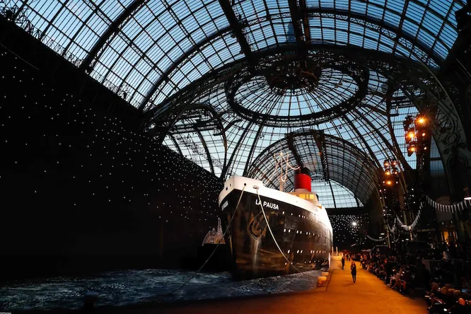Тем временем в Париже завершился показ коллекции Chanel Cruise — 2019. Второй год подряд круизное шоу прошло в Париже, в любимой локации Карла Лагерфельда - Grand Palais. C его легкой руки Большой дворец каждый раз перевоплощается то в космодром, то в античные руины, то в городской проспект или осенний пейзаж. В этот раз под прозрачным куполом величественного замка пришвартовался 100-метровый лайнер La Pausa, названный честь одноименной виллы Габриэль Шанель на Французской Ривьере.