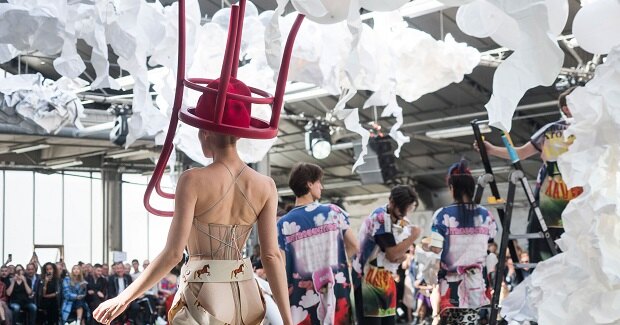 Фантазийный мир Вивьен Вествуд: цветные парики, странные корсетные платья... и модели-бодибилдеры на самокатах