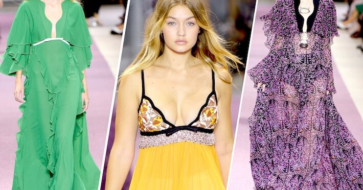 Короткая длина юбок и платьев, легкий шифон, объединенные в показе Giambattista Valli с плотными тканями и принтами в викторианском стиле, связывали образы из новой весенне-летней коллекции с искусством прерафаэлитов, в то время как замысловатые воротники и сандалии с тонкими ремешками отсылали зрителей к позднему Средневековью, а флористические узоры и свободный крой – к эстетике движения хиппи. «Исторический музей» у Джамбаттисты, однако, получился исключительно современным: подчеркивая культурный бэкграунд коллекции, он как обычно продемонстрировал свой свежий, яркий и далекий от буквоедства почерк.