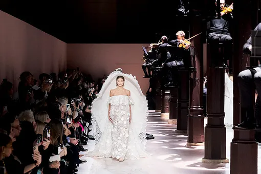 Закрывала шоу Кайя Гербер в подвенечном платье из кружевных лепестков и бутонов и в шляпке-фате. Другие не менее интересные детали показа – моносерьги-кисточки, цветные туфли-колготки тон в тон к наряду, головной убор из страз и фирменная перьевая оторочка Клэр.