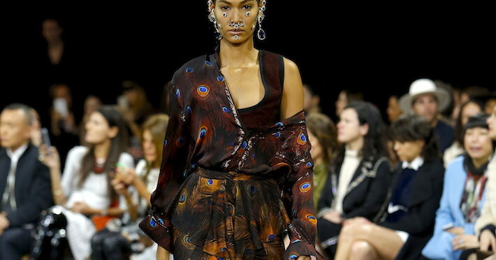 Несмотря на солидный срок на ниве службы LVMH, показы дизайнера до сих пор вызывают небывалый ажиотаж. В первом ряду – Кэти Перри, Джессика Честейн, Аманда Сейфрид и, разумеется, Ким и Канье. На подиуме – витающий на последних Неделях моды дух второй половины XIX века, преподнесенный гением Тиши наилучшим образом. Безупречный крой и интенсивность цветов, расшитые стеклярусом платья из шелкового бархата-деворе, принт перьев павлина, отточенные корсеты и фраки сочетаются с увесистыми готическими украшениями на крыльях носа, а также капельками «слез» на щеках дефилирующих моделей.