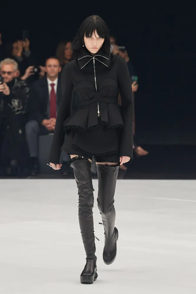Последнее, к слову — дело рук художника-сюрреалиста Джоша Смита, который известен своими абстрактными картинами. Работы Смита украсили худи, свитеры, брюки и аксессуары (например, необычные сумки-канистры). При этом креативный директор Givenchy не забыл и о тренде на сексуальность: те самые сапоги-чулки (и без того выглядящие довольно по-фетишистски) он дополнил кружевом, имитирующим выглядывающие сверху чулки, а некоторые юбки и шорты — резинками, как у торчащих стрингов. При этом основным силуэтом коллекции стал скульптурный жакет с волнообразной баской « в некоторых случаях он даже заменял мини-платья.