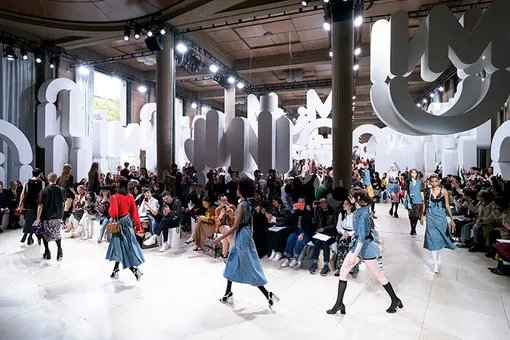 Еще перед показом осенне-зимней коллекции Miu Miu Миучча Прада призналась, что не хочет объяснять свои отсылки и исторические заимствования из моды 50-х и 60-х, которые так любит. Ей интереснее просто изображать разные личности, которые могли бы жить в те эпохи. В весенне-летнем показе эта потерянность между временами еще более заметна: с одной стороны, героини носят коротенькие челки, гольфы и пальто с большими пуговицами, чем напоминают школьниц 60-х, а с другой — ультракороткие шорты, сарафаны со спущенными лямками, кожаные комплекты и строгие жакеты, которые отсылают одновременно к панкам и офисным служащим 90-х. В коллекцию, состоящую из атласа, пайеток, кожи и тюля, вклинивается грязно-синяя джинса, из какой обычно делают предметы стритвира. Девушки будто путешествуют во времени, посещая то одну, то другую эпоху, и даже заглядывая в нашу современность, но в конце концов не могут определиться, что им точно по душе. Тем символичнее неожиданное возвращение на подиум Линдси Виксон, которая чуть больше года назад объявила о завершении модельной карьеры.