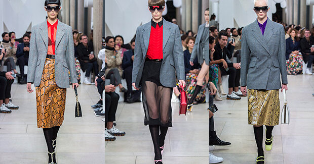 Еще перед показом осенне-зимней коллекции Miu Miu Миучча Прада призналась, что не хочет объяснять свои отсылки и исторические заимствования из моды 50-х и 60-х, которые так любит. Ей интереснее просто изображать разные личности, которые могли бы жить в те эпохи. В весенне-летнем показе эта потерянность между временами еще более заметна: с одной стороны, героини носят коротенькие челки, гольфы и пальто с большими пуговицами, чем напоминают школьниц 60-х, а с другой — ультракороткие шорты, сарафаны со спущенными лямками, кожаные комплекты и строгие жакеты, которые отсылают одновременно к панкам и офисным служащим 90-х. В коллекцию, состоящую из атласа, пайеток, кожи и тюля, вклинивается грязно-синяя джинса, из какой обычно делают предметы стритвира. Девушки будто путешествуют во времени, посещая то одну, то другую эпоху, и даже заглядывая в нашу современность, но в конце концов не могут определиться, что им точно по душе. Тем символичнее неожиданное возвращение на подиум Линдси Виксон, которая чуть больше года назад объявила о завершении модельной карьеры.