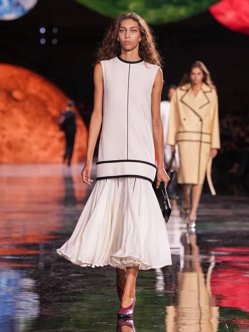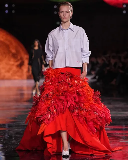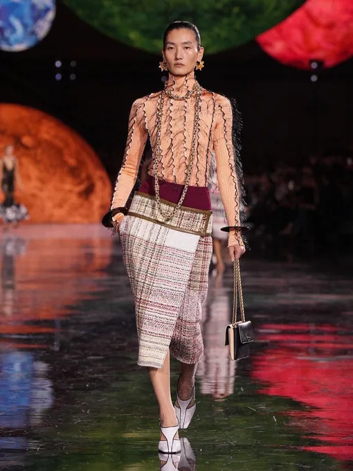 Сам дизайнер, однако, немногословен — в отличие от Джонатана Андерсона, который буквально «проспойлерил» всю коллекцию задолго до ее показа, используя кампейны, красную дорожку Венецианского кинофестиваля, и собственные социальные сети, Блази долго оставался в тени. Только в день показа мы получили 4 минималистичных фото, на которых были изображены девушка с каре, как у Коко, белый кофр, маленький дом и роскошное кресло. Все в черно-белой гамме в лучших традициях бренда. Можно было ожидать такую же аскетичность и строгость сегодня и на подиуме — однако Блази решил не играть по правилам Виржини Виар и создал более реальный и живой образ девушки Chanel, которая разгуливает по Гран-Пале под аккомпанемент из «Щелкунчика» Чайковского. Если она носит культовый твидовый костюм, то только с удобным и слегка игривым разрезом на юбке, а если выбирает жемчуг — то не простую нить, как у принцессы Дианы, а несколько максималистских массивных бус, которые уже нельзя распутать. Стоит отметить, что Матье очень качественно поработал с архивами бренда, не зацикливаясь на максимально очевидных вещах вроде камелий и костюмов с юбками. Сейчас модный Дом может рассчитывать на то, что узнаваемые двухцветные лодочки и известные стеганые сумки захотят приобрести не только преданные фанаты Chanel, но и свежая молодая аудитория.