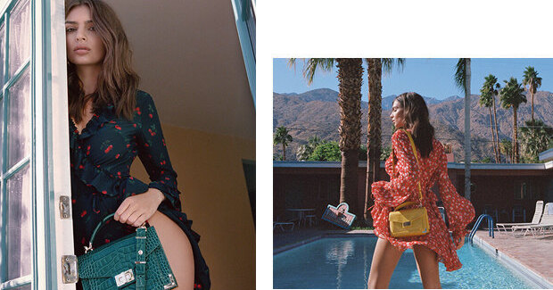 Логично,что именно Эмили стала лицом новой коллекции, и не менее логично, что не обошлось без откровенных кадров (из которых процентов на 90 состоит инстаграм (Социальная сеть признана экстремистской и запрещена на территории Российской Федерации) нашей героини): модель позирует в винтажных авто на фоне залитого солнцем Палм-Спрингс, как бы случайно демонстрируя стройные ноги, и не выпускает из рук сумки из кожи рептилии в зеленом, красном и песочно-желтом оттенках.
