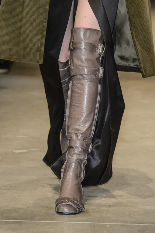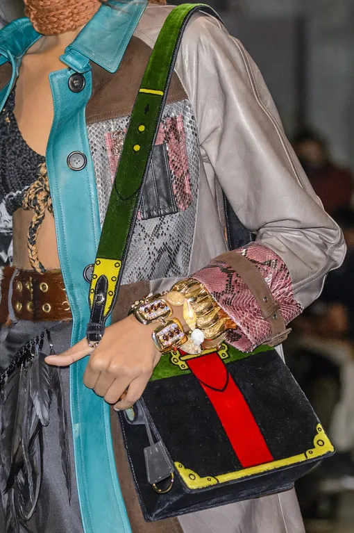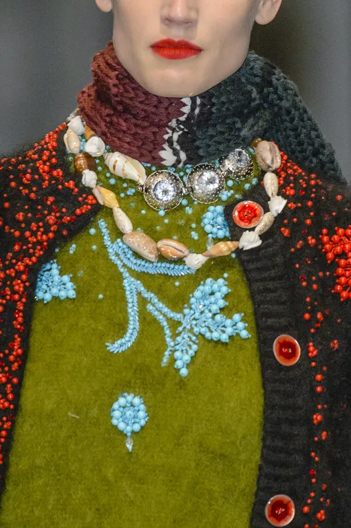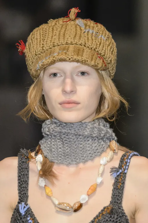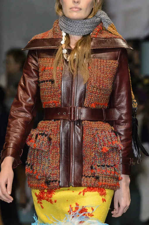 Снова и снова соединяя моду и искусство, Миучча Прада на этот раз пригласила в союзники голландского архитектора Рема Колхаса, классика Иоганна Себастьяна Баха и американского иллюстратора Роберта МакГинниса. Первого назначила ответственным за сценографию, второго «посадила» за орган, а у третьего взяла ключевой женский образ. Она нашла его на плакатах Роберта МакГинниса 70-х годов c секс-бомбами той эпохи. И это не мешает ей помнить о том, что те самые плакаты — настоящие иконы патриархального сексизма. Поэтому, иронизируя, дизайнер распечатала их на юбках, топах и платьях. Большая доля в собирательном образе ее 70-х — за городскими хиппи: весь этот вельвет, клеш, петчворк и хендмейд, вязаные купальники, ожерелья из ракушек и свитера с принтами в стиле экспрессионистов. Не менее ностальгически звучит и мотоциклетная тематика с ее квадратными куртками из цветной кожи в клепках и бисере, вязаными узорами жилетами под низ, густо подведенными черными глазами, ботфортами без каблука и кепи-восьмиклинками, собранными из разнофактурных лоскутов кожи. А чтобы не показалось мало, напоследок звучат еще и джазовые 20-е, которые соединяются с северным фолком: платья из длинной бахромы тут носят с меховыми унтами и капюшонами из пышных страусиных перьев.