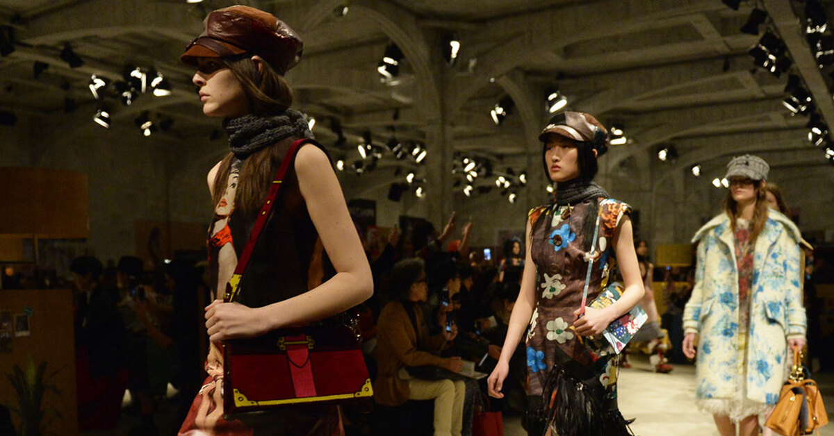 Снова и снова соединяя моду и искусство, Миучча Прада на этот раз пригласила в союзники голландского архитектора Рема Колхаса, классика Иоганна Себастьяна Баха и американского иллюстратора Роберта МакГинниса. Первого назначила ответственным за сценографию, второго «посадила» за орган, а у третьего взяла ключевой женский образ. Она нашла его на плакатах Роберта МакГинниса 70-х годов c секс-бомбами той эпохи. И это не мешает ей помнить о том, что те самые плакаты — настоящие иконы патриархального сексизма. Поэтому, иронизируя, дизайнер распечатала их на юбках, топах и платьях. Большая доля в собирательном образе ее 70-х — за городскими хиппи: весь этот вельвет, клеш, петчворк и хендмейд, вязаные купальники, ожерелья из ракушек и свитера с принтами в стиле экспрессионистов. Не менее ностальгически звучит и мотоциклетная тематика с ее квадратными куртками из цветной кожи в клепках и бисере, вязаными узорами жилетами под низ, густо подведенными черными глазами, ботфортами без каблука и кепи-восьмиклинками, собранными из разнофактурных лоскутов кожи. А чтобы не показалось мало, напоследок звучат еще и джазовые 20-е, которые соединяются с северным фолком: платья из длинной бахромы тут носят с меховыми унтами и капюшонами из пышных страусиных перьев.