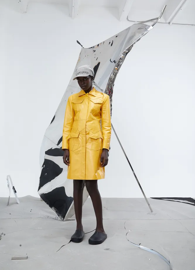 В принтах также появились черно-белые снимки ялтинского пляжа 70-х — главного советского места отдыха той эпохи. При этом в части силуэтов дизайнер осталась верна себе: в коллекции появились и ее фирменные рок-н-ролльные косухи с массивной, угловатой линией плеча, и скромные, закрытые платья-миди, и деним — направление, которое Red September активно развивают с лета, с тех пор как запустили отдельную капсулу джинсовых вещей. Из джинсы на этот раз — и привычные брюки-трубы, похожие на рабочую униформу, и юбки, и платья, буквально усыпанные объемными карманами неправильной формы (они появились даже на лифах).