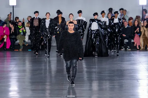 Очередной день — очередная коллекция, воспевающая 80-е (в том числе и в прямом смысле: в саундтреке исключительно хиты той поры), на этот раз от Оливье Рустена. Отдадим должное креативному директору Balmain — очень красивая. В ней и девочки, которые всего лишь хотят повеселиться, и юная Мадонна, и щедрые объемы, и неожиданные цвета, и богатая отделка — иногда, по традиции, даже чересчур богатая. Например, свитер-сетка, связанный из белоснежных перьев, к тому же расшитый стеклярусом «ожерельем» от горловины до середины груди, а надетый с пышной кожаной юбкой в острых заклепках, — не слишком ли это? Конечно, слишком. Но за такую вот чрезмерность Рустена модный мир как раз и любит. И за нее же, пусть и выраженную обычно в другом ключе, так крепко полюбил 80-е. И нам искренне хочется увидеть девушек, которые решатся надеть вечериночные платья из этой коллекции: с вживленными в корсажи шипами, огромными пайеточными розами на мини-юбках, пластиковыми корсетами и странными конструкциями из воланов, похожими в итоге на бумажные цветы.