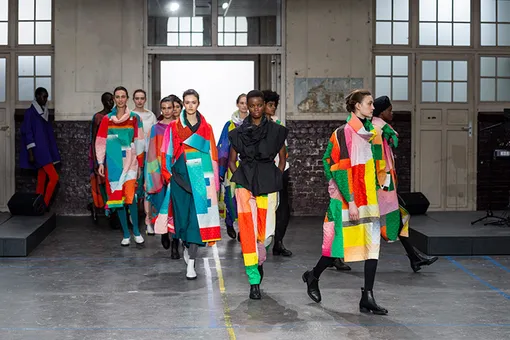 Первый день весны ознаменовался показом Issey Miyake — самым ярким за время не только Парижской недели моды, но и, возможно, всех показов осенне-зимнего сезона. Сложно припомнить хотя бы один цвет, который не появился так или иначе в этот день на подиуме. Причем не в цветных тотал-луках, как на большинстве других шоу, а вперемешку. Конечно, была коллекция Dries Van Noten — бельгиец славится в том числе своей мастерской работой с цветом. Но и на его показе такого буйства красок мы не наблюдали.