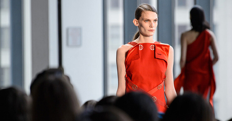 Коралловый шелк с овчиной, пуховики без рукавов и платья в технике оригами на шоу Dion Lee