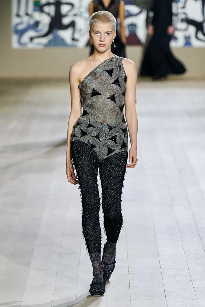 После шоу Мария Грация рассказала, что самое пристальное внимание в этот раз уделила вышивке. Она сделала ее не только декоративным приемом, но и конструктивным — в некоторых образах именно вышивка формирует и держит весь силуэт. Акцент на нее сделан также в обуви и колготках, расшитых бисером и кристаллами. Именно они берут на себя все внимание в лаконичных луках с вещами простых силуэтов в сдержанной черно-белой гамме.
