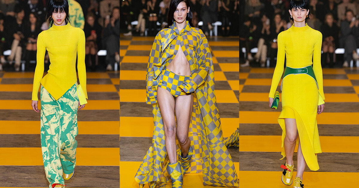 Костюмы с гоночной разметкой, вареный деним и топы — оптические иллюзии на показе Off-White