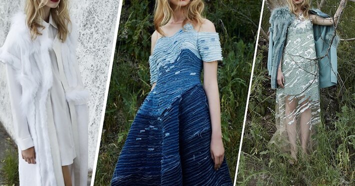 Алена Ахмадуллина продолжает вдохновляться русскими сказками: после основанной на иллюстрациях Татьяны Мавриной осенне-зимней коллекции, она решила посвятить схожей теме первую в истории бренда капсулу Alena Akhmadullina Resort 2016. Дизайнера воодушевила сказка «Садко» и, в первую очередь, воплощенная в ней тема морской стихии и подводного мира. Образ волн повлиял на крой изделий, а также на выбор цветов и авторские принты, близкие к полотнам художников-маринистов. Впрочем, главным приемом Алены стал объемный декор из пластика и меха. Вместе с плавными линиями волн он образует морские структуры на ткани. Мех также широко представлен в коллекции в виде аппликаций: на вязаном трикотаже или в «вечернем» прочтении. Общее настроение капсулы поддерживают и вещи из денима, которые Ахмадуллина начала активно использовать с прошлого сезона. Новая для дизайнера джинсовая тема проявилась в предметах с объемной фактурой и эффектом деграде от светло-голубого до глубокого синего цвета.