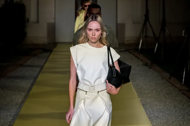 Показ открылся мини-фильмом режиссера Луки Гуаданиньо (который, к слову, совсем недавно представил на Венецианском кинофестивале документальный фильм о жизни и карьере Сальваторе Феррагамо). Ролик был явно навеян фильмами Хичкока — и визуально, и по ощущениям. Надо сказать, более удачный первоисточник найти трудно: его кино — это не только потрясающе рафинированная картинка, но еще и удивительно близкое нашему времени пронизывающее чувство тревоги и томительного ожидания развязки. Сразу после окончания мини-фильма начался показ. Его открыла настоящая хичкоковская блондинка Кики Виллемс (о любви режиссера к белокурым героиням знают все — в разное время главные роли в его фильмах играли Ким Новак, Типпи Хедрен и Грейс Келли) в графичном белом платье с широким поясом. Чуть позже на подиуме появился бледно-желтый костюм из объемного жакета и юбки-карандаш — очевидная отсылка к гардеробу Типпи Хедрен в «Птицах». Позже мы увидим еще два лука, навеянных легендарным триллером — брюки и платье, украшенные перьями. По мере того, как шоу продвигалось к финалу, ощущение напряжения и саспенса постепенно сходило на нет, то снова росло, пока в конце его не закрыла Мариякарла Босконо в топе оттенка бургунди и светло-розовой шелковой юбке макси. Как и в случае с фильмами легендарного режиссера, конец оказался довольно светлым и позитивным. Ведь именно этого мы ждем и от нашего непростого времени — чтобы, несмотря на все тяготы ожидания, все разрешилось наилучшим образом. Уловить витающие в воздухе настроения и дать им форму в ткани — довольно непростая задача, требующая от дизайнера гибкого ума и развитого абстрактного мышления. В этот раз Полу Эндрю это блестяще удалось. Тем более похвально, что это получилось сделать всего в 33 луках (для смешанной мужской и женской коллекции — довольно скромная цифра). Потому будем с нетерпением ждать продолжения этой истории — либо начала новой.
