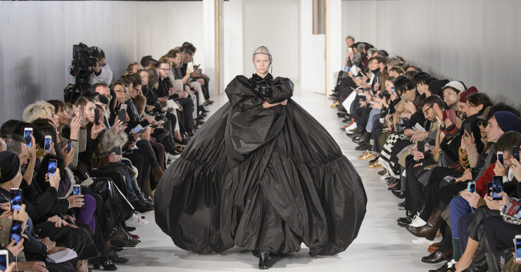 Сегодня в Париже прошел показ кутюрной коллекции Maison Margiela. На подиум выходили модели в сложных деконструированных платьях, асимметричных топах, расшитых тонким кружевом, бахромой и кристаллами, и объемных юбках в пол, декорированных тонкими лентами. Одним из самых запоминающихся предметов коллекции стала длинная прозрачная рубашка с лицом-аппликацией. Закрывала показ модель в черном объемном платье с массивным, будто дутым, шлейфом.