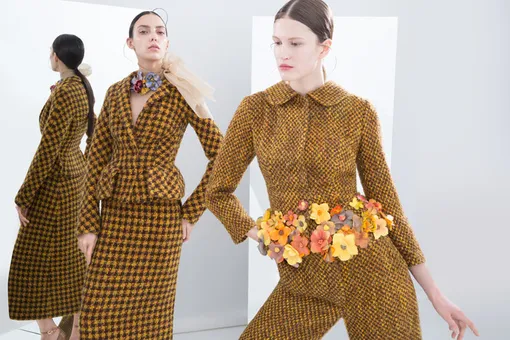 В апреле представив свою первую коллекцию на подиуме Mercedes-Benz Fashion Week Russia, Евгения Крюкова не стала тянуть с лукбуком. Цветные сорочки и юбки-колокола, платья-пальто с пышной шифоновой имитацией цветного меха и узкие твидовые жакеты, украшенные цветочными аппликациями, похожими на пестрые поляны, дизайнер расположила в кадре на фоне зеркального лабиринта и массивных украшений из керамических цветочных гирлянд с собственной фарфоровой мануфактуры. Как будто оттуда же и главные героини съемки, похожие на фарфоровых кукол с глянцевыми щеками. Их аристократическая бледность, гладкие проборы и макияж «без макияжа» — идеальный фон для коллекции со сложносочиненным декором.