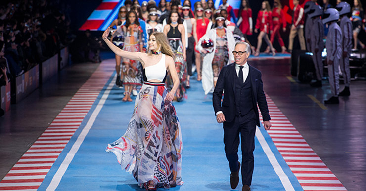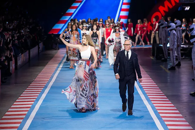 Вслед за Донателлой Версаче, Ральфом Лореном и Миуччей Прадой тема автогонок завладела и Томми Хилфигером — идеи для новой весенне-летней коллекции американский классик и его муза Джиджи Хадид искали в гардеробе автогонщиков, на скоростных трассах и трибунах с ликующими болельщиками, ссылаясь на любовь Томми к гонкам и насыщенный событиями и настоящим драйвом образ жизни Джиджи. Отсюда в коллекции, представленной на импровизированном гоночном треке в экспоцентре Milano Congressi, кожаные брюки, куртки и бомберы в ярких нашивках, комбинезоны на блестящих молниях, боди и купальники в спортивной стилистике, козырьки, солнцезащитные очки и кожаные перчатки, раскрашенные в культовое сочетание фирменных цветов: красного, синего и белого, — на этот раз сложенное в тематическую шашечку с гоночных флагов.