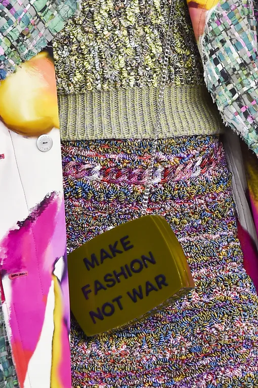Дом Dior — пацифистский по своей сути: он был создан в 1947 году, всего через пару лет после окончания Второй мировой, и внес значительный вклад в восстановление послевоенной индустрии моды во Франции. Так что обойти своим вниманием антивоенную тему его бывший креативный директор Джон Гальяно не мог. В его весенне-летней коллекции 2005 года появились футболки, лонгсливы и жакеты с яркими принтами и нашивками с пацифистскими лозунгами: «Dior for peace» («Dior за мир»).