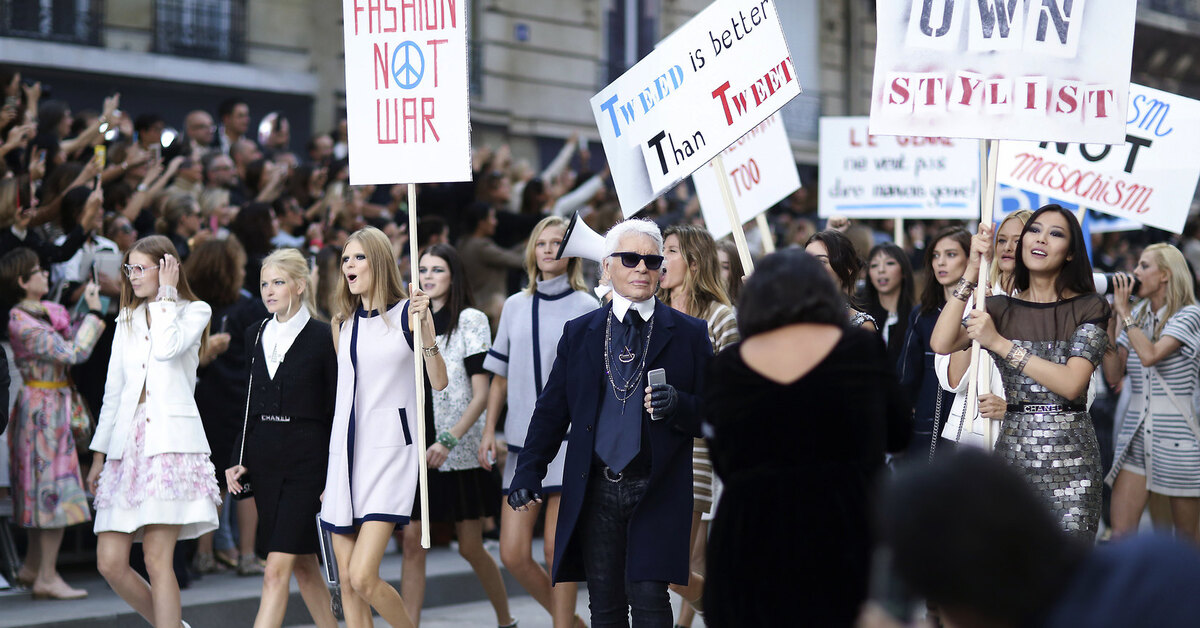 Не смог удержаться от протестных настроений и Карл Лагерфельд. Легендарный Кайзер превратил подиум на весеннем шоу Chanel 2015 года в шумную парижскую улицу, по которой идет толпа протестующих с транспарантами.