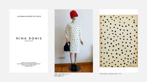 Новая коллекция Нины Неретиной и Дониса Пуписа собрана «с миру по горошине». В центре внимания - классический принт polka dot, но среди дизайнерских референсов в лукбуке-мудборде не только и не столько 80-е как время самого яркого горохового бума, а целый калейдоскоп явок и паролей, подсказывающих, откуда в коллекцию попал этот нестареющий принт. Среди них и советские мультфильмы, и голливудская классика, и современное искусство. Пригоршня горошин — с платья молодой Елизаветы II, вторая — с полотна Марка Ротко, третья — из инсталляции Яеи Кусамы, а четвертая — и не горошины вовсе, а снежинки с рождественской открытки.