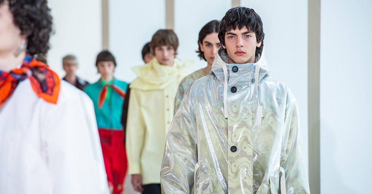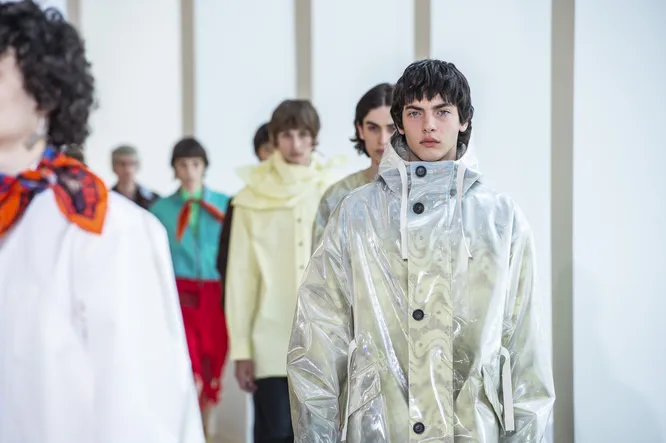 Мужские велосипедки в рубчик, прозрачные галстуки и обувь с шипами на показе Acne Studios