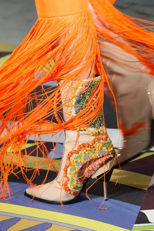 Взяв лучшее из истории Дома Emilio Pucci, ДНК которого составляет работа с принтованным шелком с набивными рисунками в виде ярких психоделических узоров, креативный директор бренда Массимилиано Джорджетти всего за пару лет сформировал новое видение дальнейшего пути для марки. В рамки уже имеющейся концепции он умудрился вписаться по принципу «все свое ношу с собой» и составил новый гардероб Emulio Pucci из шедших на ура в коллекциях основанного им MSGM асимметричных фасонов, пестрой крикливой графики, оверсайза и искромсанных подолов. Дизайнер не мелочится и работает исключительно «крупными мазками». Никаких витиеватых узоров и филигранной цветописи — в коллекции исключительно образы из крупных колористических неоновых блоков.