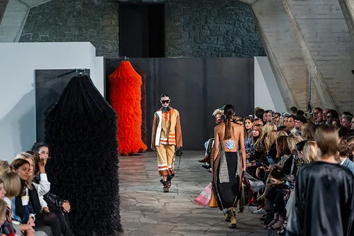 Эти недели моды характеризует одна главная черта — дизайнеры перестают разделять одежду по сезонам, предлагая практичные вещи на любую погоду. Например, в весенне-летней коллекции Джонатана Андерсона для Loewe есть замшевые брюки и рубашки, уютные свитеры и оверсайз-кардиганы, вязаные штаны и плотные джинсовые платья и даже полусапоги — все это захочется носить и сегодня. Интересной коллекцию делают не только красивые материалы, принты и сочетание теплых глубоких цветов, но и искусные неповторимые детали. Это отделка бахромой в виде шахматной разметки на платье-рубашке, кожаные воротнички, которые напоминают средневековые доспехи, вязаные сумки, будто сделанные заботливой бабушкой, разноцветные перья, которыми декорированы плетеные авоськи и атласные брюки, и многое другое. Андерсон в очередной раз доказал, что повседневная одежда может и должна выглядеть нетривиально.
