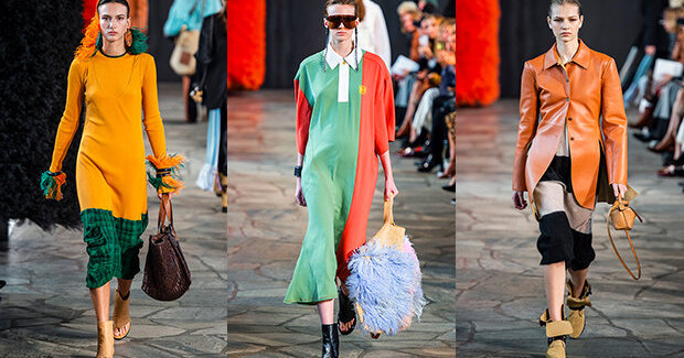 Эти недели моды характеризует одна главная черта — дизайнеры перестают разделять одежду по сезонам, предлагая практичные вещи на любую погоду. Например, в весенне-летней коллекции Джонатана Андерсона для Loewe есть замшевые брюки и рубашки, уютные свитеры и оверсайз-кардиганы, вязаные штаны и плотные джинсовые платья и даже полусапоги — все это захочется носить и сегодня. Интересной коллекцию делают не только красивые материалы, принты и сочетание теплых глубоких цветов, но и искусные неповторимые детали. Это отделка бахромой в виде шахматной разметки на платье-рубашке, кожаные воротнички, которые напоминают средневековые доспехи, вязаные сумки, будто сделанные заботливой бабушкой, разноцветные перья, которыми декорированы плетеные авоськи и атласные брюки, и многое другое. Андерсон в очередной раз доказал, что повседневная одежда может и должна выглядеть нетривиально.