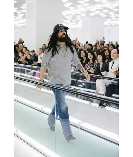 Соответствующим вышел и сеттинг: абсолютно пустое, почти стерильно белое пространство, разрезанное светящейся линией траволатора. Он и проносил мимо гостей, нацеливших на подиум свои айфоны, моделей, одетых в новый Gucci — ничего лишнего, минимум отвлекающих деталей. Без перформанса, впрочем, все же не обошлось: сперва по траволатору проехала группа героев в смирительных рубашках, которые потом они скинули, дав начало самому показу. Метафора вполне прямолинейная: мода существует для того, чтобы освобождать нас от стереотипов и позволить каждому быть собой. Что Микеле на протяжении всей своей публичной карьеры и делает, борясь с гардеробными стереотипами как минимум гендерными.