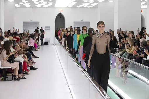 Конечно, минимализм Алессандро Микеле и минимализм в его традиционном модном понимании — вещи совершенно разные. Представить себе перчатки с браслетами из пуль вокруг запястий, кисти бахромы, броши-бабочки, похожие на такие же заколки из детства, очки с пластиковыми цепями и прочие аксессуары с показа Gucci в коллекции какого-нибудь истинного минималиста, пожалуй, нельзя. Просто все познается в сравнении: деталей действительно стало меньше, силуэты и сами образы стали намного чище. Вместо богатых текстур и принтов Микеле, наоборот, сделал ставку на прозрачность — там, где еще недавно у его модели был бы пышный бант, теперь оказывается черная дымка-сетка, никак не скрывающая грудь. Там, где были складчатые юбки и кардиганы, словно вытащенные из бабушкиного сундука, теперь невесомые прозрачные платья, подчеркивающие тело, а не прячущие его. Раньше кружева, органза и тюль, открывающие грудь, ноги, тело в целом в коллекциях Gucci тоже встречались. Но появлялись с какой-то дизайнерской отстраненностью: это никогда не было сексуальным, чувственным, соблазнительным. Чувственность Микеле в принципе исследовал только в мужских образах, потому что с чувственностью и хрупкостью мужской мир моды и общество в целом не слишком в ладах — а продавать женскую одежду через сексуальность самые разные бренды привыкли уже давно. Теперь же снова обновившийся Gucci затрагивает вопросы телесности женщин — и это так неожиданно, что удивляет едва ли не больше отсутствия привычного экстра-стайлинга.