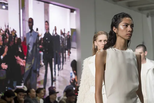В отличие от Оливера, который и в Доме имени Хельмута Ланга делал все-таки одежду Шейна Оливера, новые дизайнеры работают максимально близко к оригиналу. Вмешательство чужого почерка не чувствуется совсем: это те же предельно лаконичные, визуально скупые платья, костюмы, пальто и брюки. Плюс деним, плюс кожа, плюс акцент на теле, которое эту одежду носит, но ненавязчивый — пудровая рубашка вместо белой, так что кажется, что рубашки нет вовсе, или голый торс, в любом случае почти полностью закрытый жакетом.