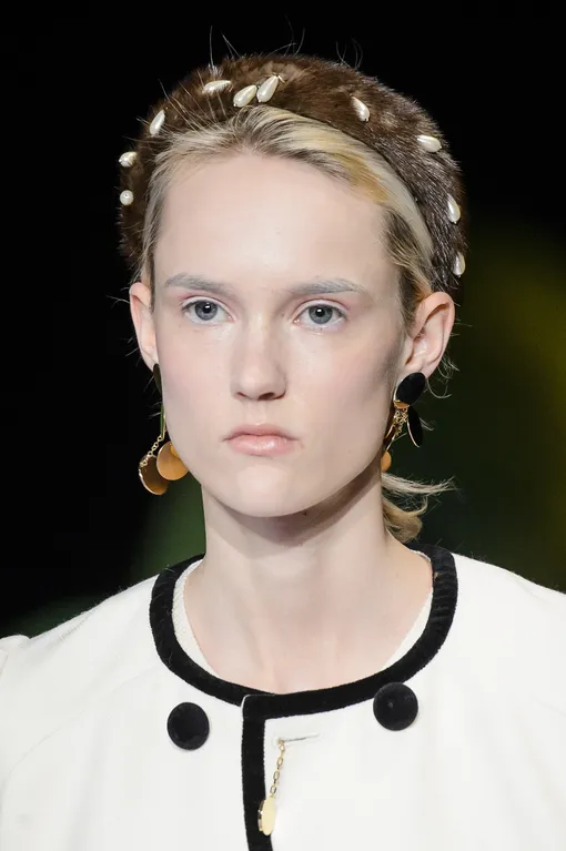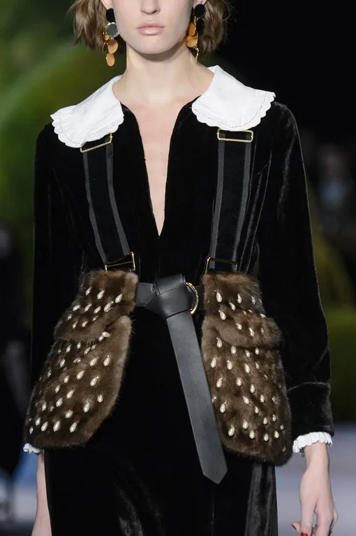 Дизайнер сдружил историческую и мотоциклетную эстетику в рамках одной палитры — содержимого ювелирной шкатулки: изумрудный, рубиновый, топаз и сапфир. Благодаря этому стыку историческая тема не переигрывает с театральностью, а жесткая байкерская эстетика смягчается под натиском не свойственных ей вычурных живописных деталей сказочного историзма. Наш фаворит среди них — покрытая жемчужной сеткой меховая баска на грубом ремне и заменяющий диадему обруч для волос.